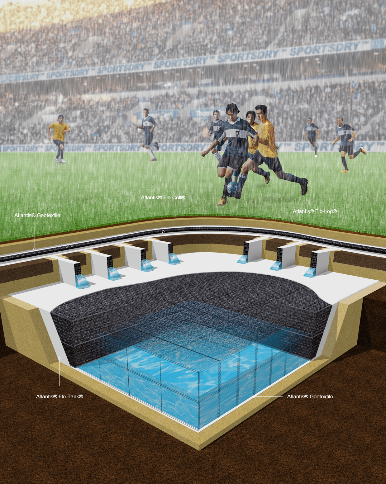 Atlantis Flo-Cell® serisi, spor sahalarının drenajı, inşaat işleri, istinat duvarları ve peyzaj uygulamaları